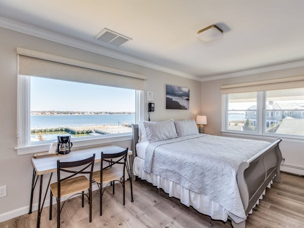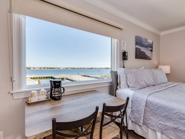 Water front bungalow has Queen size bed, sofa bed, full kitchen, living room, full bathroom ,balcony, central air.